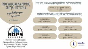 Mieszkańcy powiatu mogą skorzystać z ostatnich terminów nieodpłatnej pomocy prawnej i nieodpłatnej pomocy psychologicznej w ramach zadania „Stop przemocy – wsparcie”. • Zapisy / kontakt: pod numerem telefonu 730-312-959 lub mailowo fundacjapasieka@gmail.com lub biurofundacjapasieka@gmail.com • Miejsce świadczenia pomocy: – pomoc prawna (stacjonarnie): Rzeszów, ul. Hetmańska 7/4 – pomoc psychologiczna (stacjonarnie): Rzeszów, ul. Hetmańska 4 – zdalnie – możliwość dojazdu do beneficjenta (po umówieniu, dla