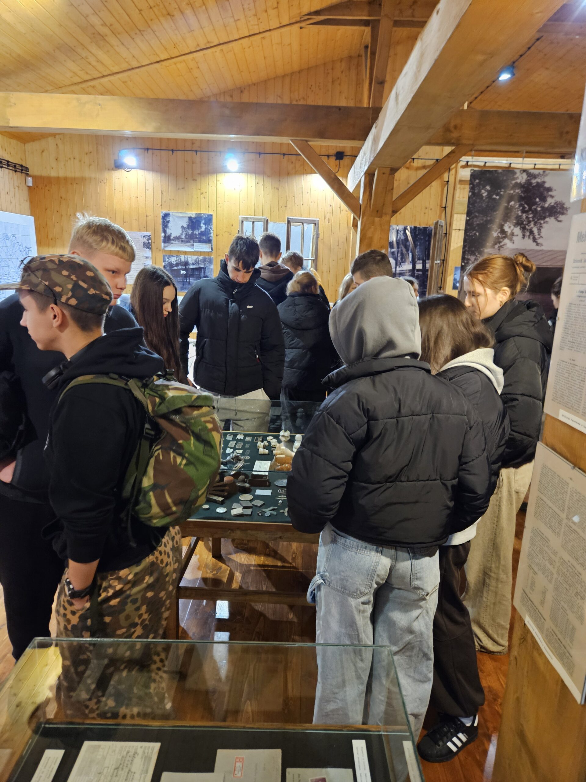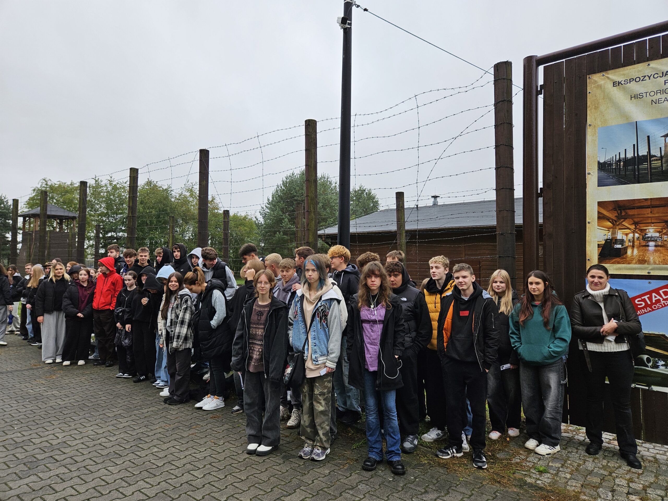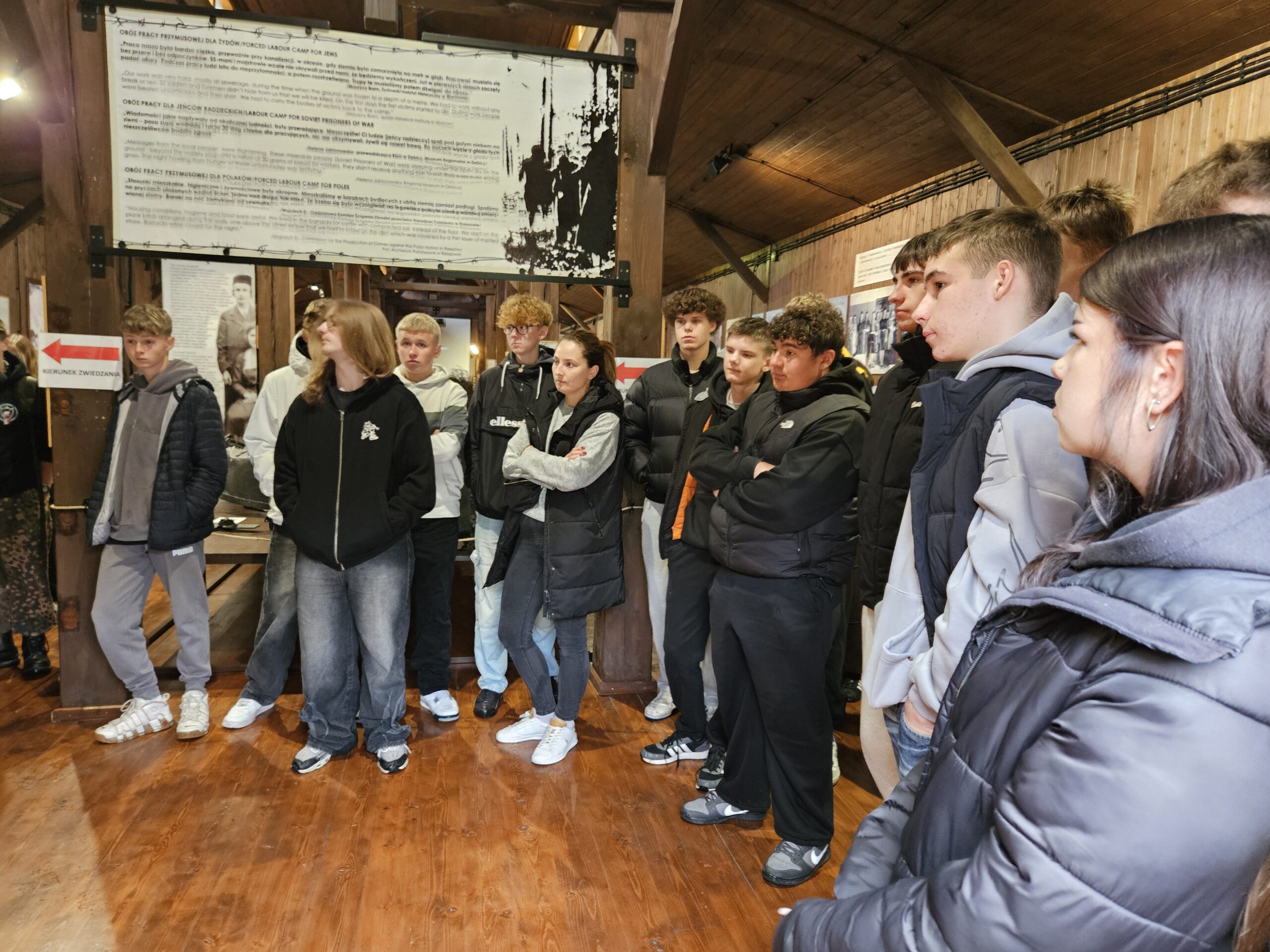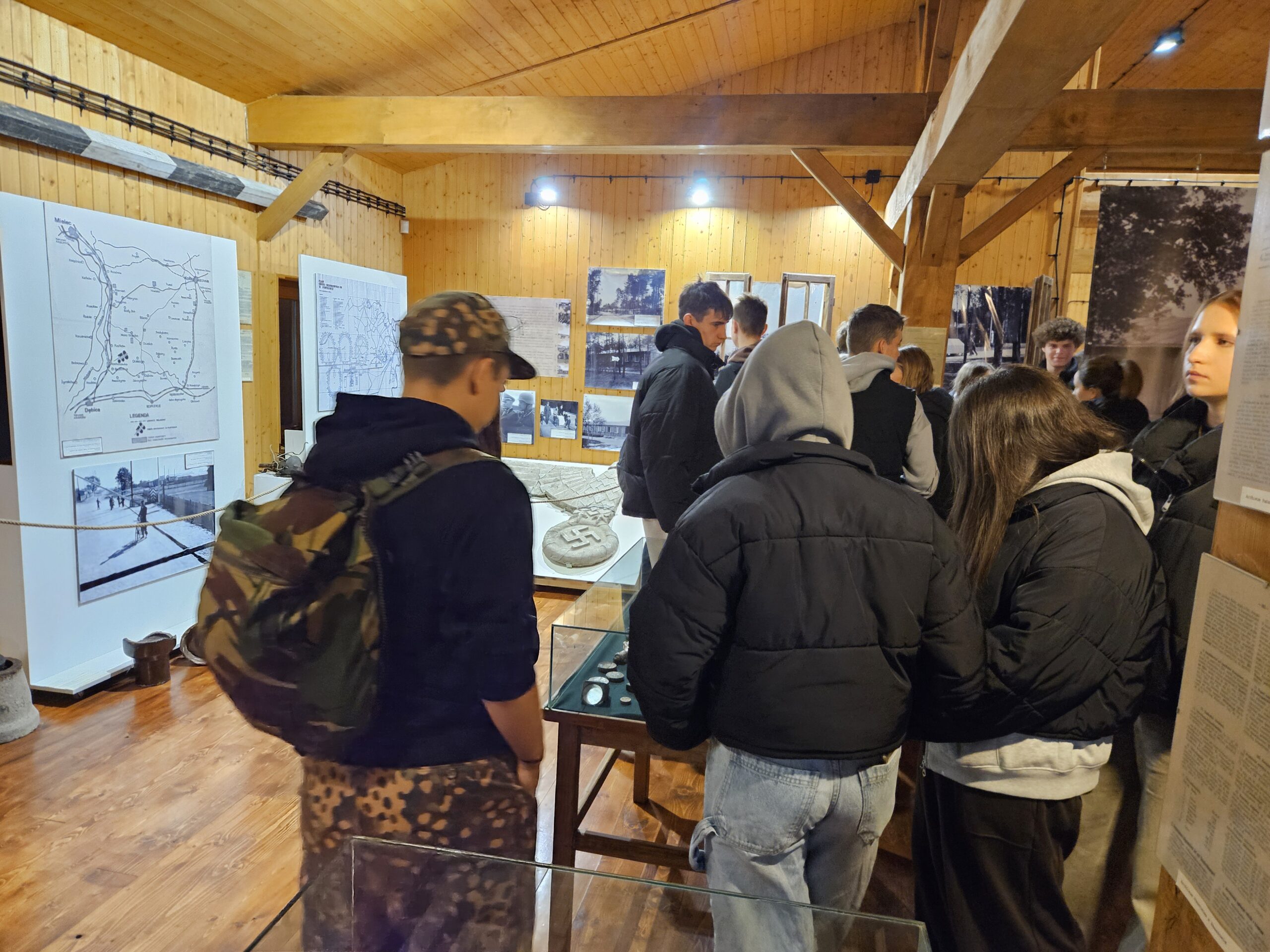 Pierwszym przystankiem była Ekspozycja Historyczno-Dydaktyczna w Pustkowie Osiedlu, zlokalizowana na terenie dawnego hitlerowskiego poligonu wojskowego „SS Truppen-Übungs-Platz Heidelager”. Jest to miejsce szczególne – pełne pamiątek po ludziach, którzy trafili tu wbrew swojej woli. Uczniowie zobaczyli zrekonstruowane baraki, dokumenty, przedmioty codziennego użytku i narzędzia pracy, które opowiadają historię więźniów lepiej niż jakikolwiek podręcznik. Każdy eksponat to osobna opowieść o głodzie, chłodzie, wycieńczeniu i ludzkim dramacie.