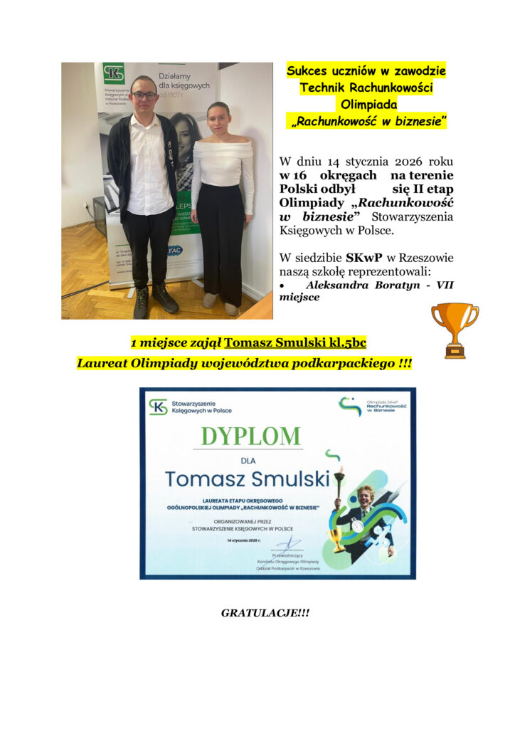 30 stycznia, 2026 Sukces uczniów w zawodzie Technik Rachunkowości Olimpiada „Rachunkowość w biznesie”