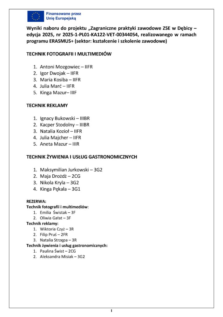Projekt „Zagraniczne praktyki zawodowe ZSE w Dębicy – edycja 2025” nr 2025-1-PL01-KA122-VET-00344054, realizowanego w ramach programu ERASMUS+ (sektor: kształcenie i szkolenie zawodowe)
