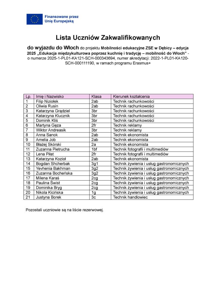 Projekt Mobilności edukacyjne ZSE w Dębicy – edycja 2025 „Edukacja międzykulturowa poprzez kuchnię i tradycję – mobilność do Włoch” – o numerze 2025-1-PL01-KA121-SCH-000343694, numer akredytacji: 2022-1-PL01-KA120-SCH-000111190, w ramach programu Erasmus+